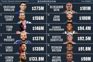 NBA篮球勇士湖人詹姆斯库里雄鹿字母哥火箭 体育资讯10月6日讯 今天,美媒BoardRoom转载了世界范围内收入(工资+代言)最高的运动员排名,这份榜单最早发布于今年5月。其中,C罗2.75亿断档最高,库里1.56亿第2,梅西1.35亿第5,詹姆斯1.338亿第6。另外,进入前20的NBA球员还有杜兰特(1.014亿第10)、字母哥(0.944亿第13)。